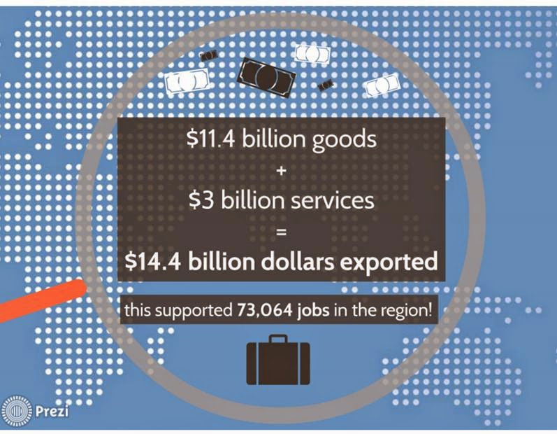 - In 2012, our region exported over $14.4 billion dollars, specifically $11,442,120,000 in total manufactured goods and $3,002,470,000 in total services.