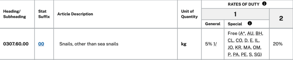 - Column 1– Special: This section provides a reduced or duty-free rate, if applicable, utilized by countries that have a free trade agreement or preferential trade program with the United States. With the example of snails, imports from countries named within the listed abbreviations would not be subject to any duties.